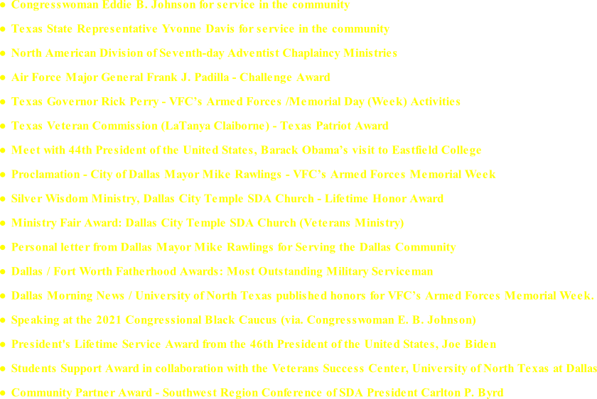 The transformative chapter in my life began with my service in the U.S. Marines from 1985 to 1993, three days after I graduated from high school, which profoundly shaped my perspective by blending both my adversities and triumphs. Drawing from my military experience, childhood challenges, and my work with disabled veterans in DFW nursing homes, I took the initiative to establish two impactful outreach organizations. I have also worked to connect five governmental bodies in the Dallas/Fort Worth area to better serve disenfranchised military personnel in our community. I am deeply committed to tackling issues such as homelessness, accessing benefits, fostering Christian family life, addressing incarceration, and promoting mental health awareness.