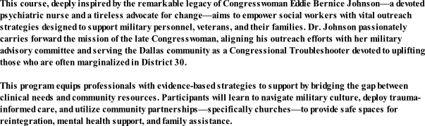 This course offers a detailed exploration of Eddie Bernice Johnson's advocacy for mental health services, specifically for those who serve. Focus on psychosocial assessments, military culture competency, and reducing stigma for help-seeking behavior. Implementing effective outreach strategies to identify military families in need, focusing on community resilience and connecting families with available mental health resources.